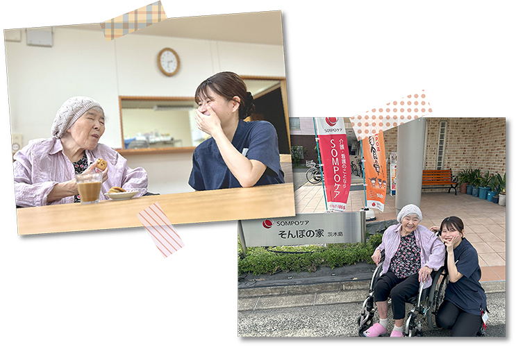 ご入居者さまの笑顔が見られた瞬間です。日々の関わりの中で信頼して心を開いてくださったと感じるとき、「この仕事をしていてよかった」と心から思います。