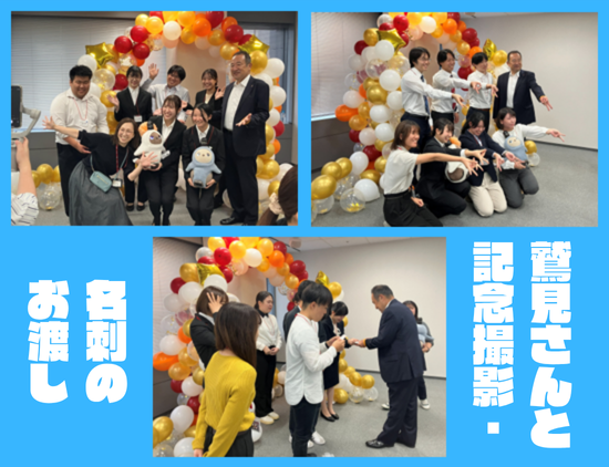 内定者からさまざまなポーズの希望に対し、快く応じる鷲見さん。撮影後は、内定者一人ひとりに名刺を渡されていました。