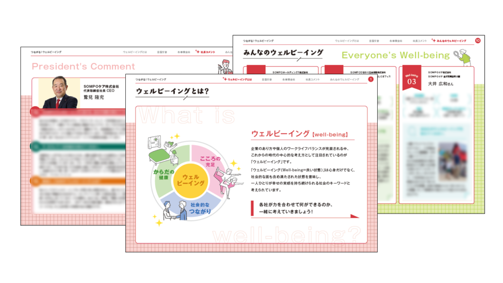 グループ各社のご協力のもとSOMPOケアが制作した、合同社内報「つながる!ウェルビーイング」です。