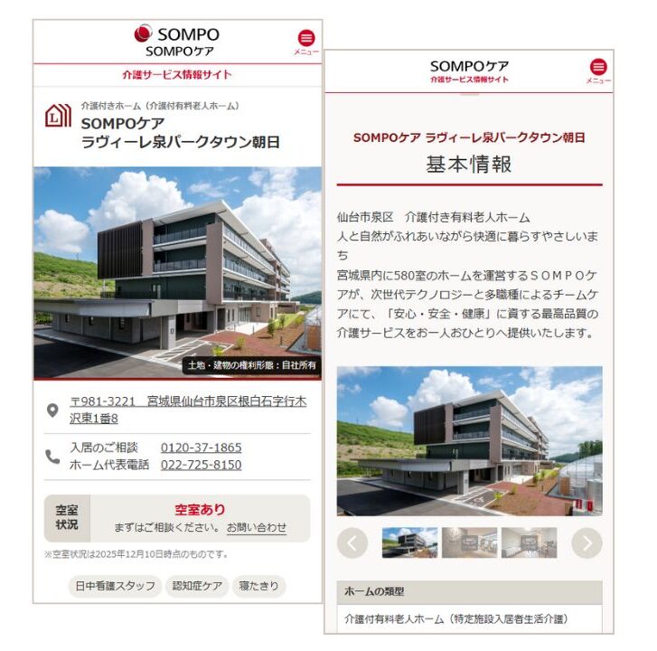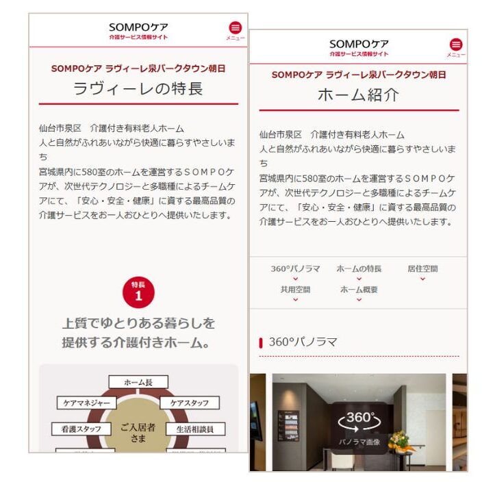 施設詳細ページでは、全体のデザインを刷新しました。また、ホームへの入居を検討されている方に必要な情報を整理・検討したうえで、各ページに掲載する情報を充実させました。