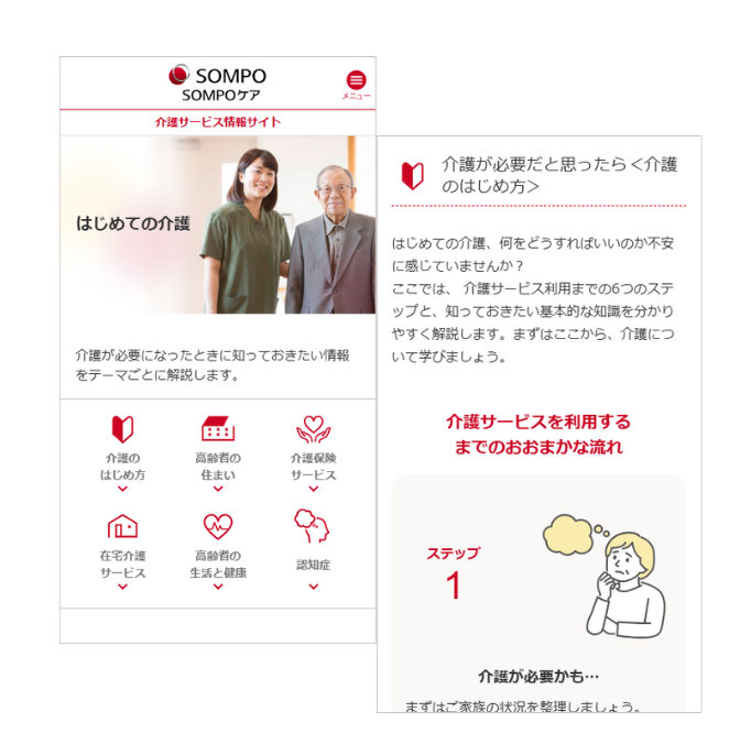 サイトのデザイン・設計を見直しただけでなく、介護サービスを利用するまでの流れを紹介するコンテンツ「はじめての介護」も新設し、介護が必要になったときに知っておきたい情報を充実させました。