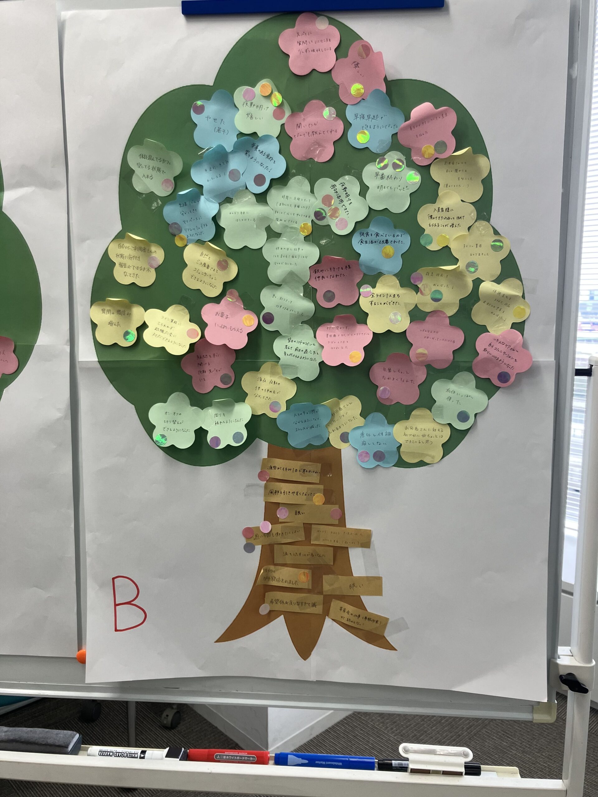 グループワークでは、現場で働く中で感じたことや考えたことを参加者それぞれが付箋に書き出し、付箋を貼り合わせて「一本の木」を作成します。
