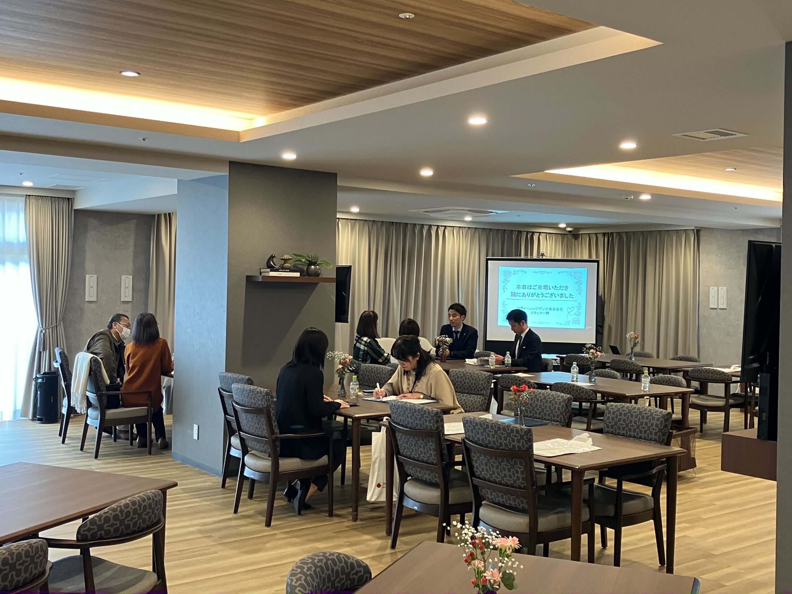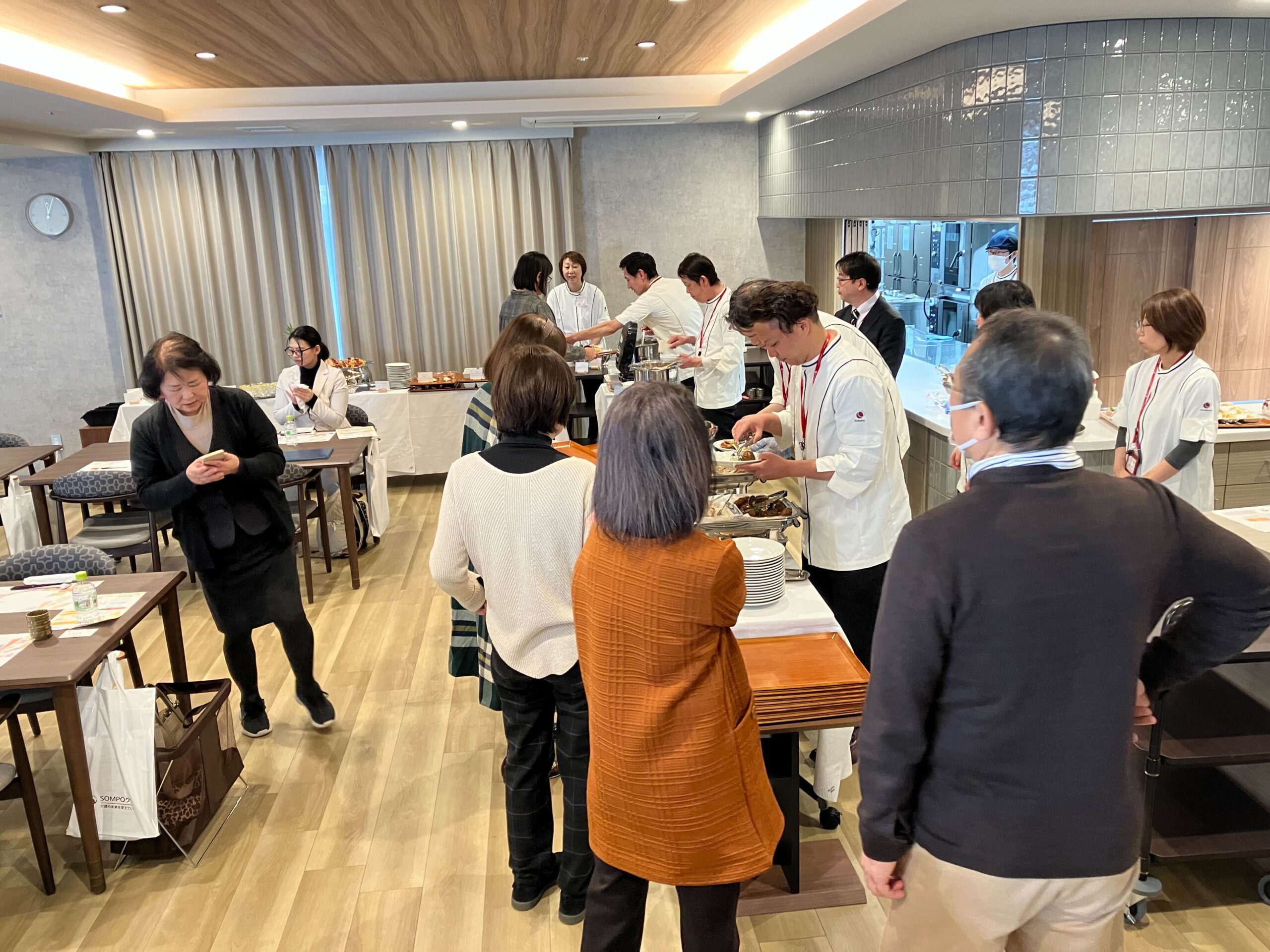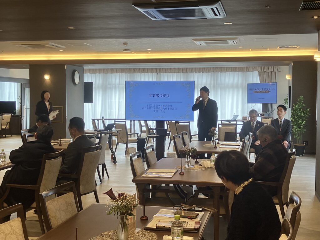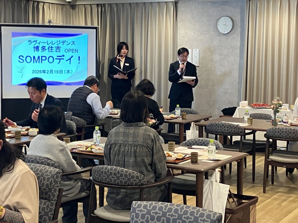 2月19日にはラヴィーレレジデンス博多住吉で、翌20日にはラヴィーレ平和大通りにおいて、それぞれSOMPOデイ!が開催されました。入居を検討されている損保ジャパンやSOMPOひまわり生命のお客さま、そのご家族、代理店の方々などをお招きし、ホームでの暮らしやサービスを実際に「見て・感じて・イメージ」していただく機会としました。