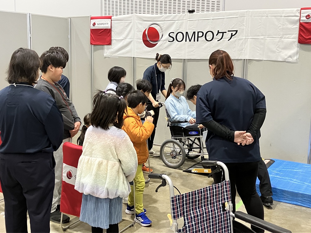 SOMPOケアは、車椅子操作や介護体験プログラムを提供するブースを出展しました。スタッフは安全確認や手順を丁寧に説明し、実演も交えながら体験をサポートしています。