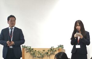新入職員の代表者は、そんぽの家 東久留米中央 新入職員の坂本 愛莉さん(写真:左)。