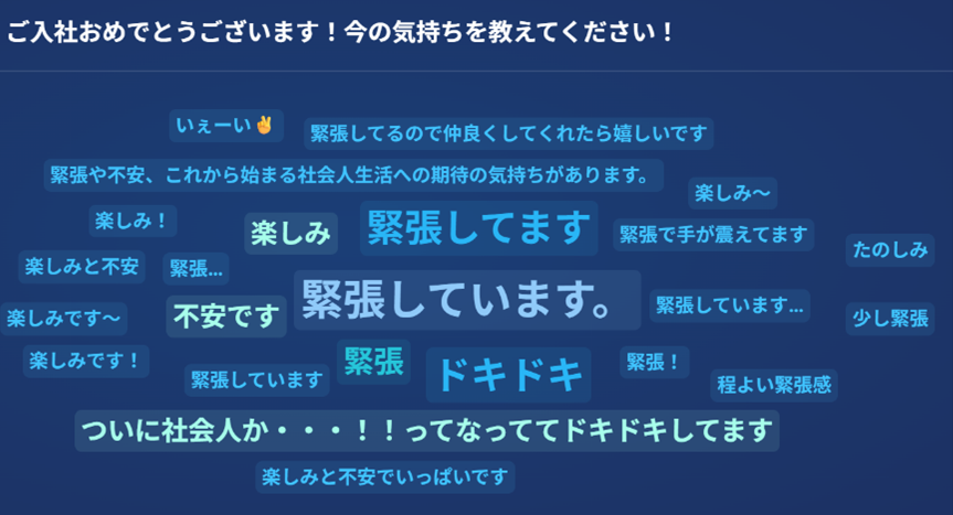 開式前に「今の気持ち」を新入職員がスマホから送信すると、会場スクリーンにリアルタイムに表示されます。 同じ言葉はまとめられ、投稿数が多い言葉は文字サイズが大きくなります!