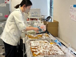 ラヴィーレレジデンス戸塚 キッチンスタッフ 山本 静さん(SOMPOケアフーズ 先輩職員)が開発した「野菜たっぷりのパウンドケーキ」を試食。当社のホームでも提供された一品です。「野菜の味がしっかりしている」「甘すぎなくて美味しい」と大好評でした!