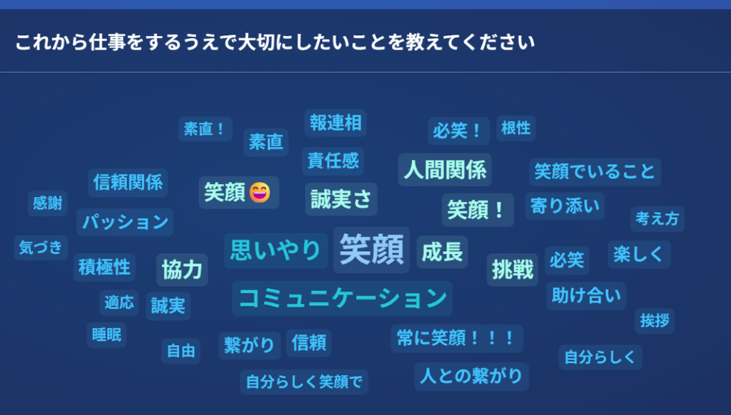 「笑顔」と回答した方が最も多く、次いで「成長」「人間関係」「協力」「挑戦」などの回答が目立ちました!