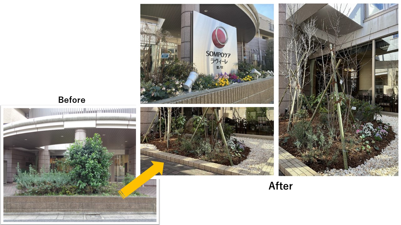 そこで、以前のようにお庭を活用しご入居者さまに自然と触れ合っていただく機会を作り、交流の場を増やすことで笑顔になっていただきたいという職員の想いから、今年1月に改修がスタートし、約3か月半をかけて完成を迎えました。