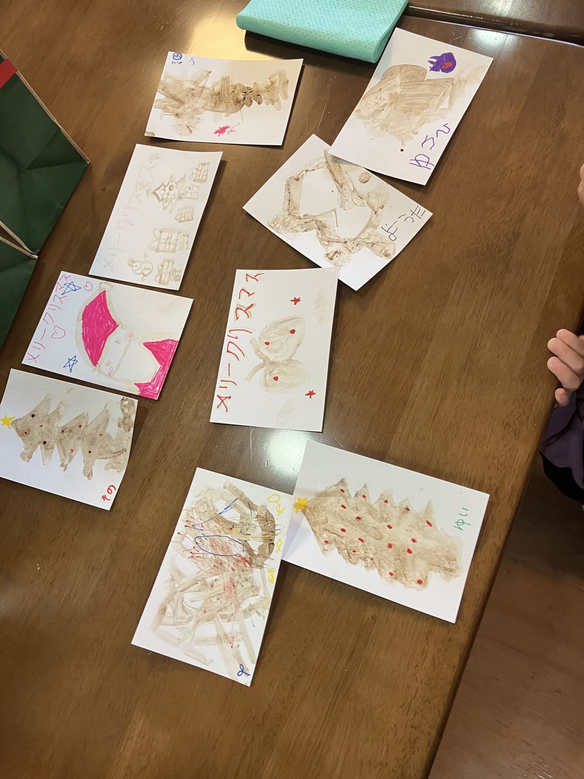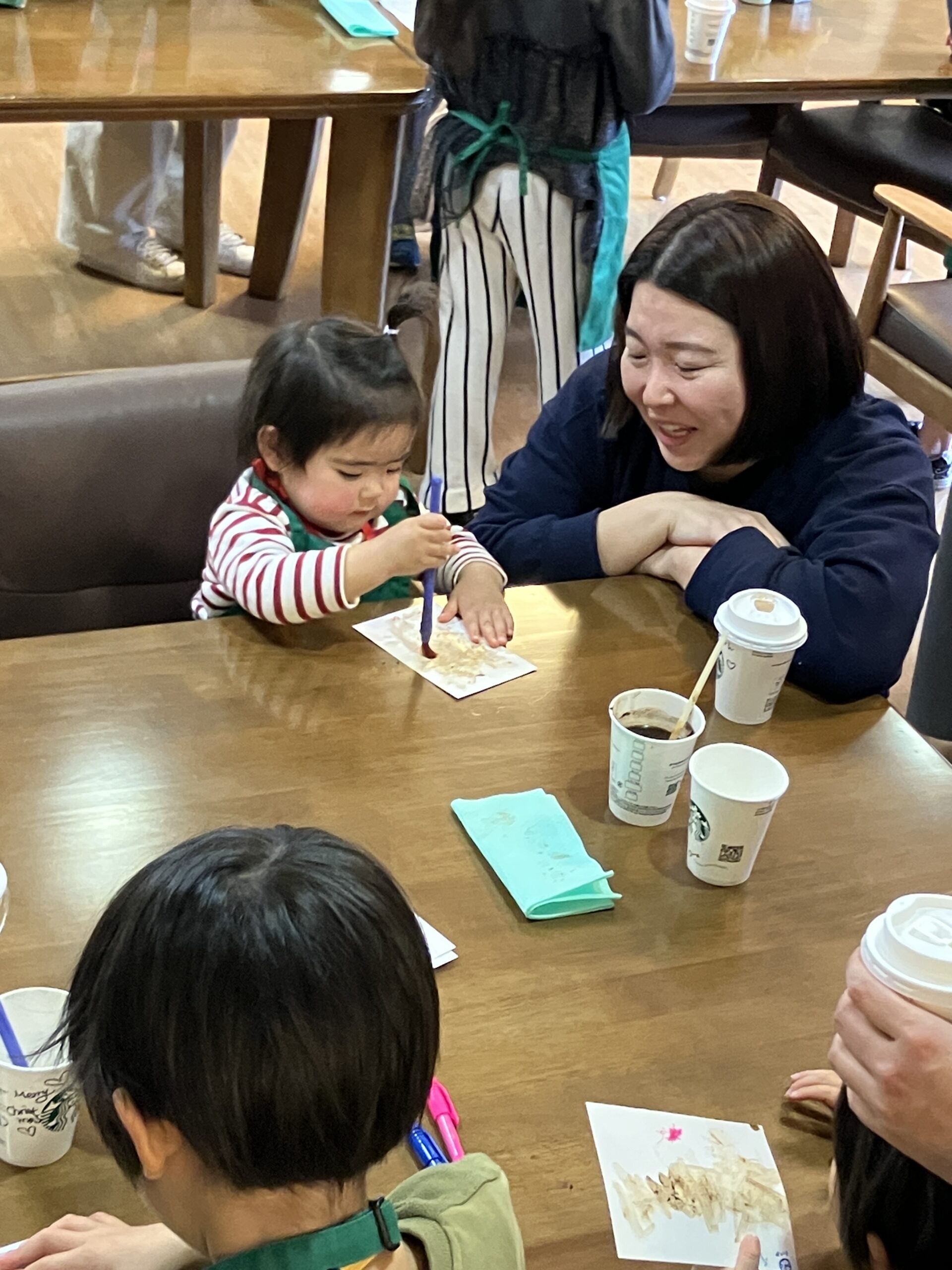 コーヒーの出がらしを絵の具のように活用し、子どもたちは思い思いのイラストを描きました。普段とは違うユニークな画材に、子どもたちの想像力も刺激された様子。個性豊かなメッセージカードが次々と完成し、環境への配慮を学びつつイベントの思い出を形にする素敵な時間となりました。