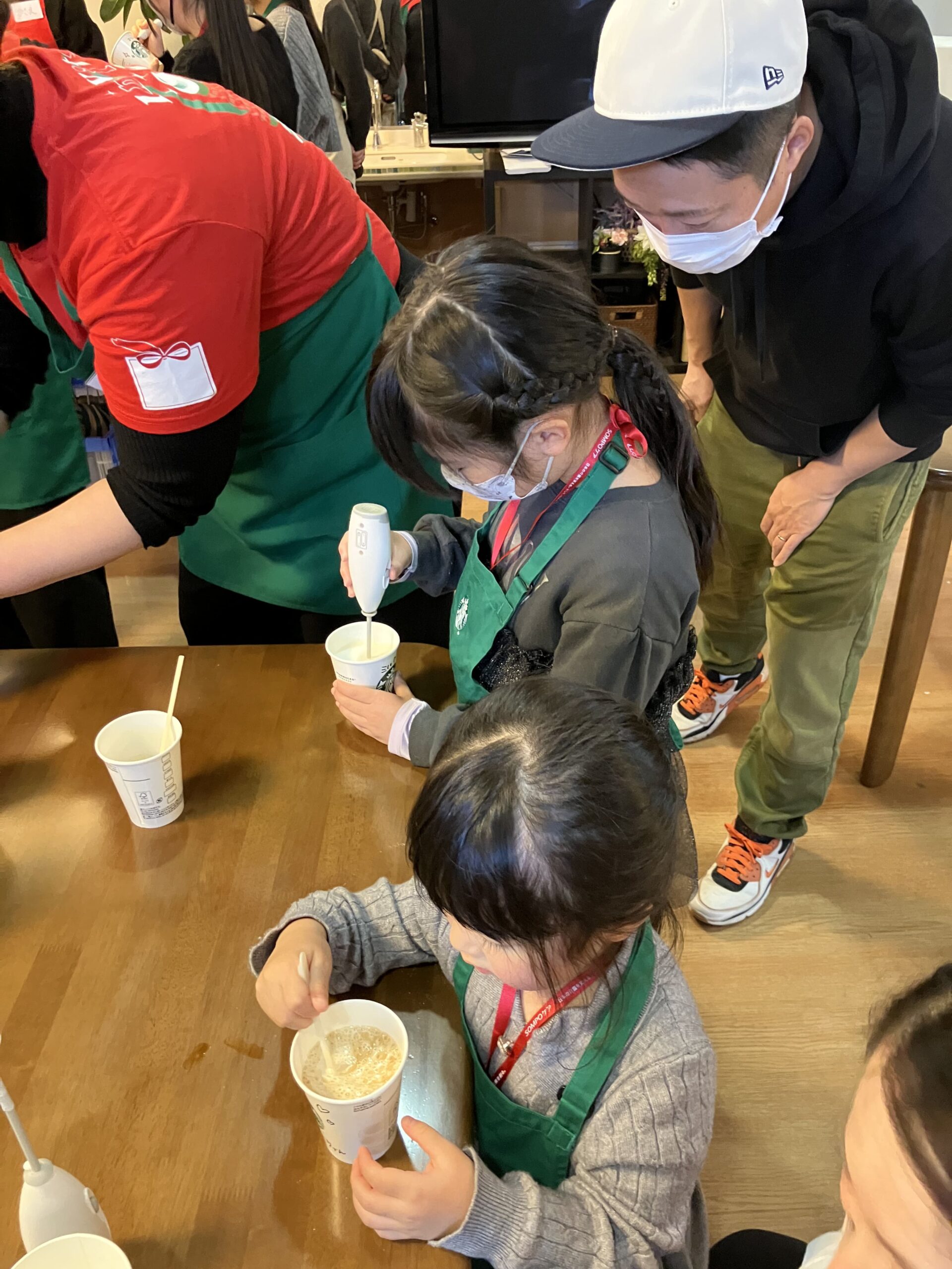 子どもたちは目を輝かせながらスターバックスのエプロンを身につけ、バリスタに大変身! スターバックスのパートナーの皆さんと一緒に、ドリンク作りに挑戦しました。慣れない手つきながらも、真剣な眼差しでミルクの泡立てを体験しました。