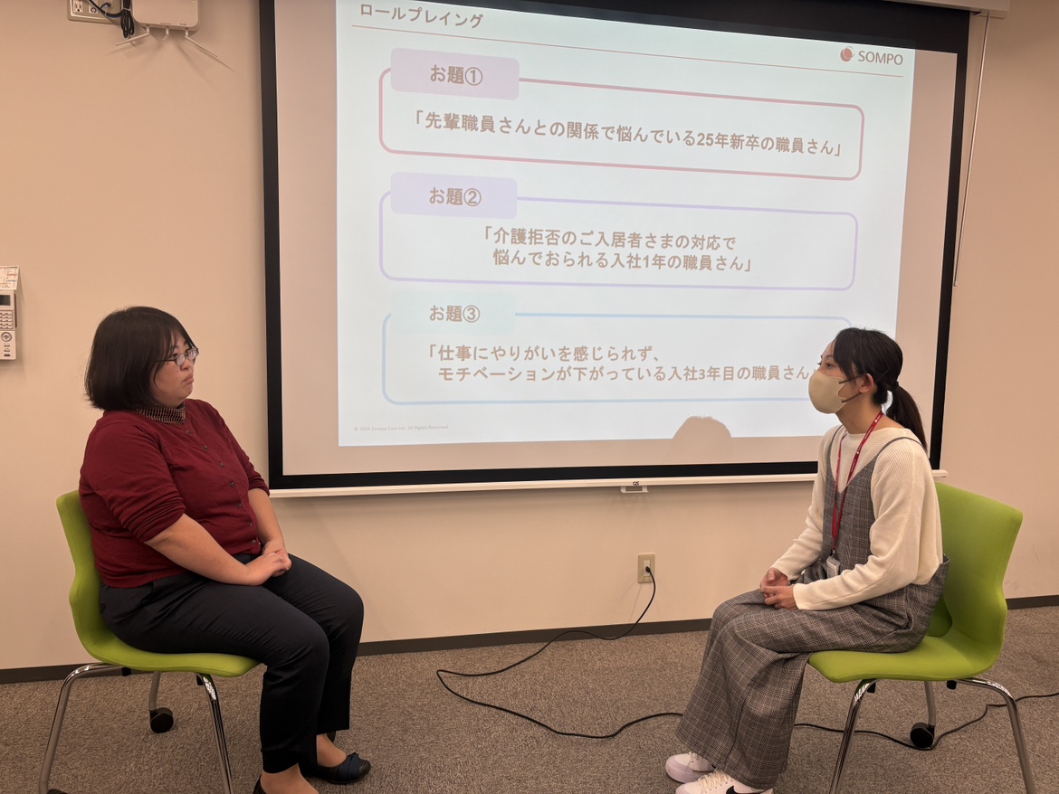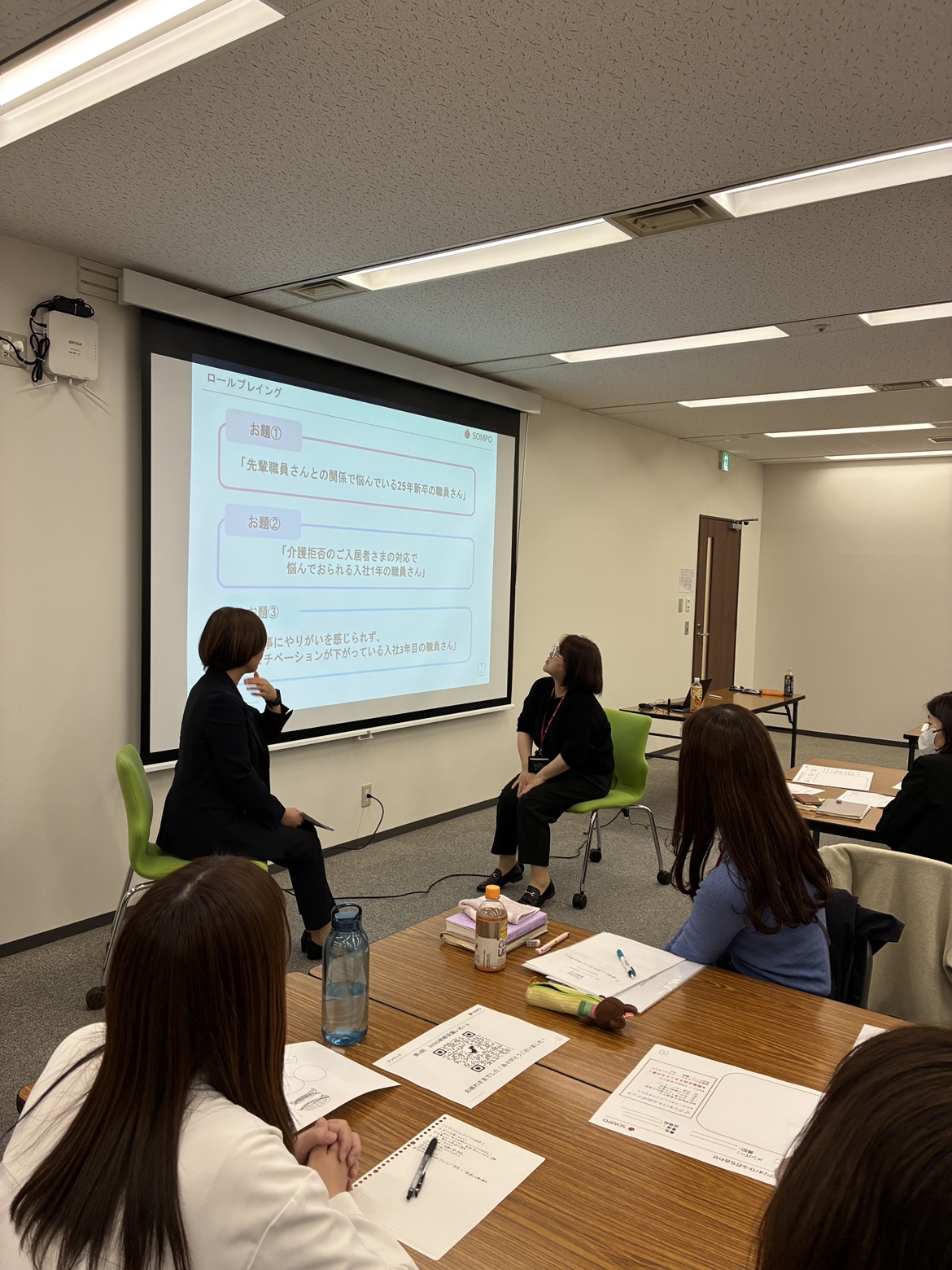 さらに、「ロールプレイング」では、事務局メンバーが職員役となり、「先輩職員との関係」「介護拒否のご入居者さま対応」「仕事へのやりがい喪失」といった具体的な悩みに対し、参加者が傾聴と対応を実践的に訓練しました。