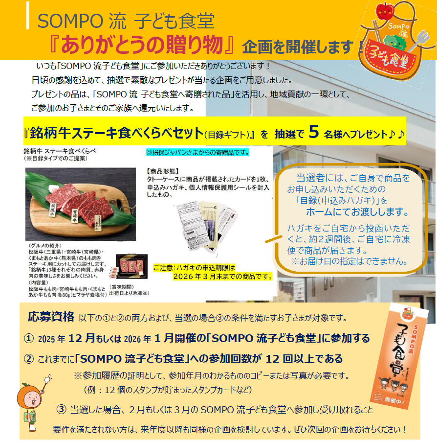 本企画は、損害保険ジャパン株式会社保険サービス部さまからご厚意で寄贈いただいた『銘柄牛ステーキ食べくらべセット(目録ギフト)』を、これまでにSOMPO流 子ども食堂へ12回以上ご参加いただいた方の中から、抽選で全国5名のお子さまにプレゼントするというものです。