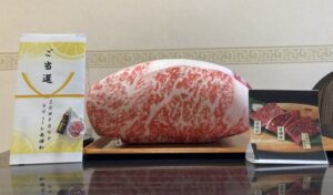 写真映えするようにと、目録に合わせて松坂牛クッションがホームで準備され一緒に贈呈されました。