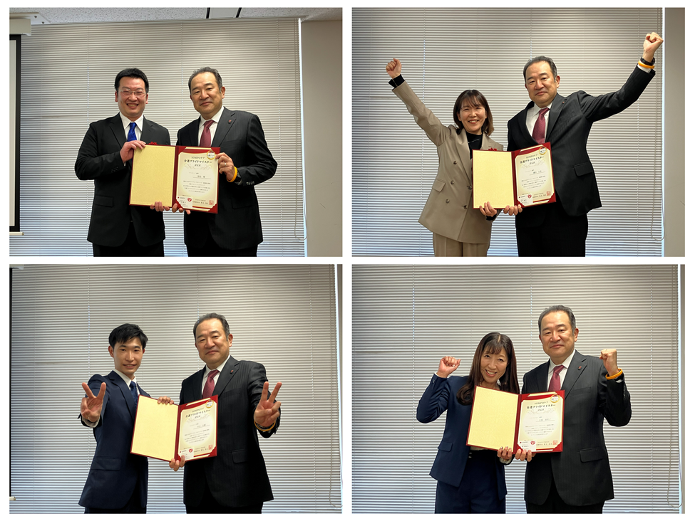 社長の鷲見さんから、介護プライドマイスター一人ひとりに認定証が手渡されるとともに、鷲見さんとのツーショット撮影も行われました。