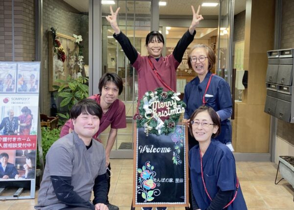 左上から:中村さん(ホーム長)、小松さん(副ホーム長)、久保田さん(ケアマネ)、山浦さん(ケアスタッフ)、相川さん(ケアコン)