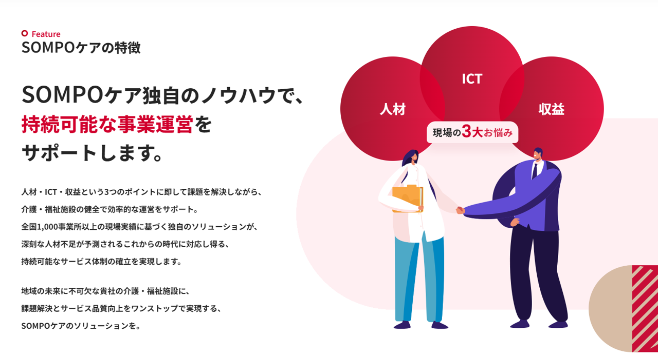 SOMPOケアでは介護を必要としている方以外にも、介護事業者をサポートするためのソリューション事業を展開していることなど……