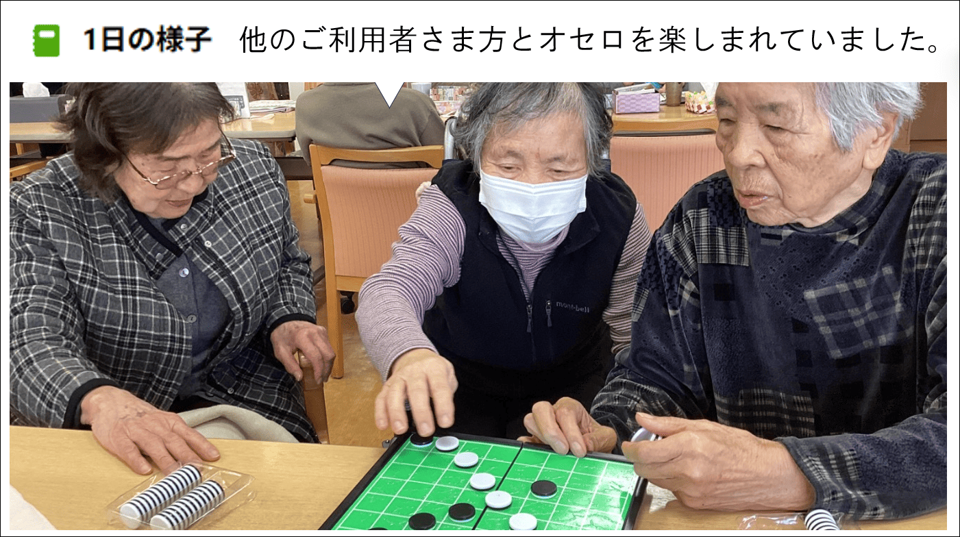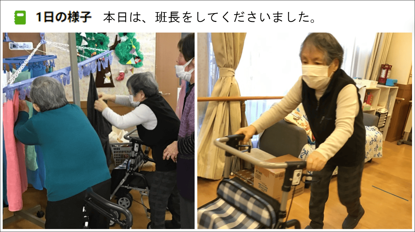 岩瀬さんは、「ご利用者さまが役割ややりがいを持ち、前向きな姿をご家族に報告するツールとして、ケアエールPROが活躍しています」と語ります。