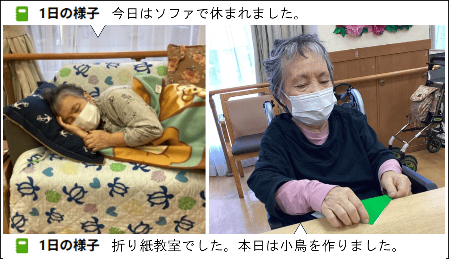 ・ご家族の理解と信頼獲得: 視力など言葉で伝えにくい状況も写真で具体的に共有。良い面も課題も率直に伝え、ご家族はケアへの理解を深め、厚い信頼へ。