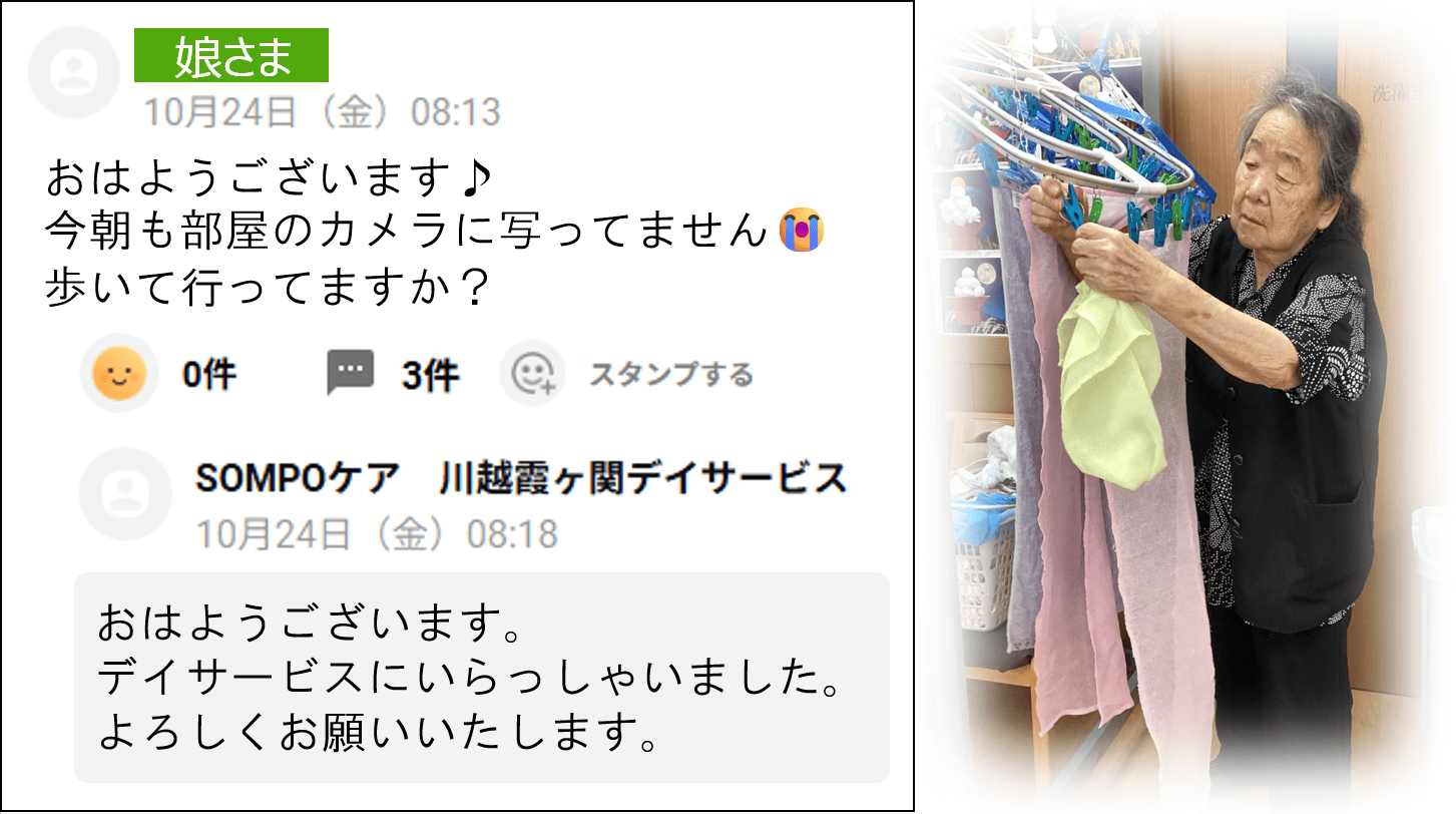 こうした取組みの中で、多くのご利用者さまが生き生きと役割を担ったり、日々の活動に参加されるようになったといいます。例えば、Sさまは、班長を務めることで役割を得て、デイサービスに行くことが何よりの楽しみになりました。それはお休みの日でも朝早くから歩いて来所されてしまうほどで、今ではほぼ毎日利用されています。ご家族はSさまの認知症を案じ、見守りカメラでご不在の際に心配されていましたが、ケアエールによって川越霞ヶ関デイサービスへの通所が確認できるようになりました。これがご家族の安心につながり、Sさまの自立した生活をケアエールが支えています。