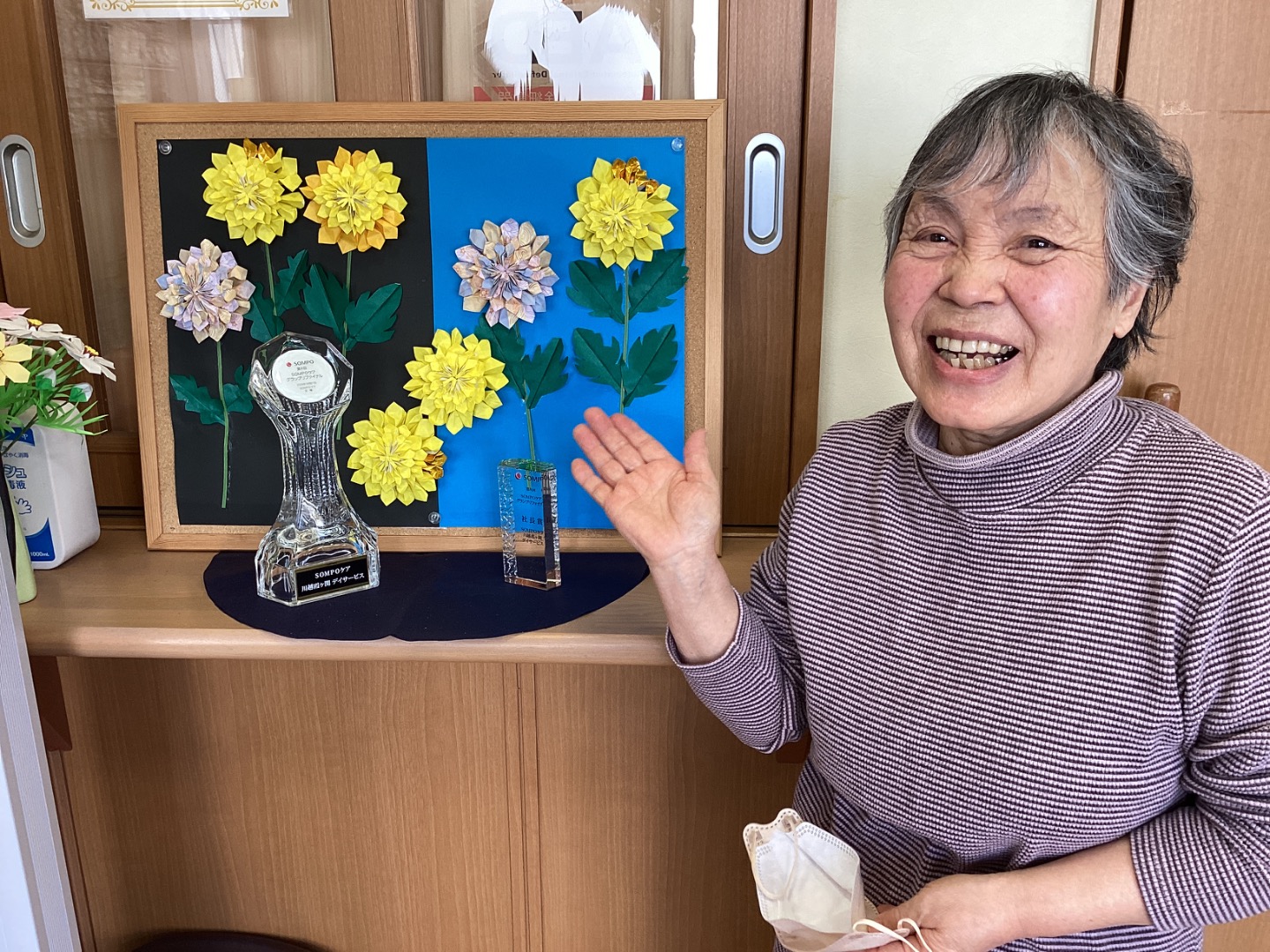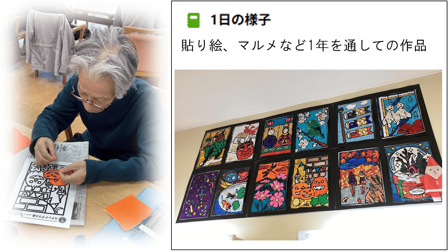 今では、ちぎり絵や貼り絵といった季節感あふれる作品で自身の展示会を開くことが目標になっています。制作中のご様子はケアエールを通じて遠方の娘さまやケアマネジャーにも共有されており、Kさまの変化は多くの方に喜びをもたらしています。