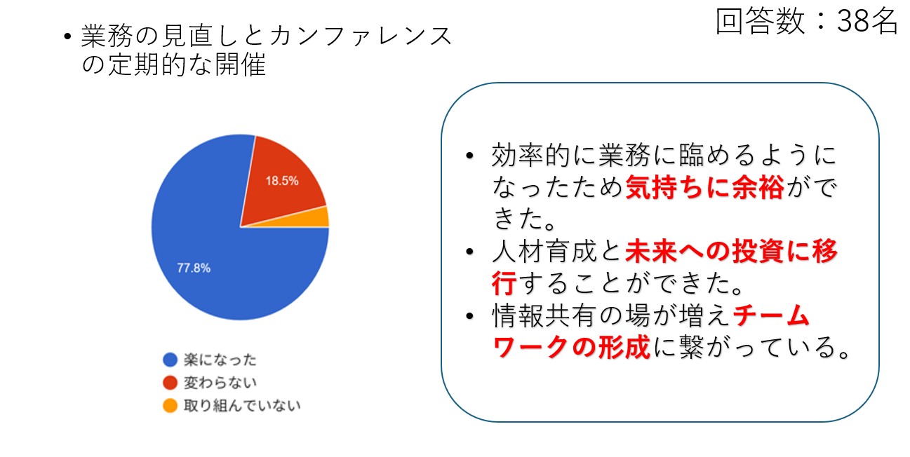 どの管理者も「C領域」である対話時間が大幅に増加し、ある事業所ではコミュニケーションの割合が0.9%から40.2%へと劇的にアップ。 スタッフからは「一緒に笑う時間が増えた」「気持ちに余裕ができた」「組織として考えるようになった」といった声が上がっています。