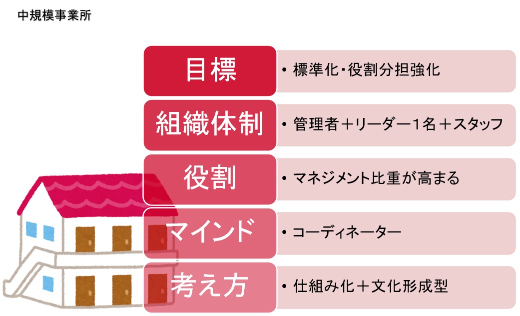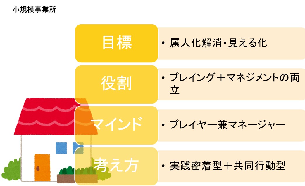 そして最大の成果は、参加者全員で「管理者の役割」を可視化・言語化できたことです。事業所の規模に応じた管理者の役割を、具体的なモデルとして整理しました。
