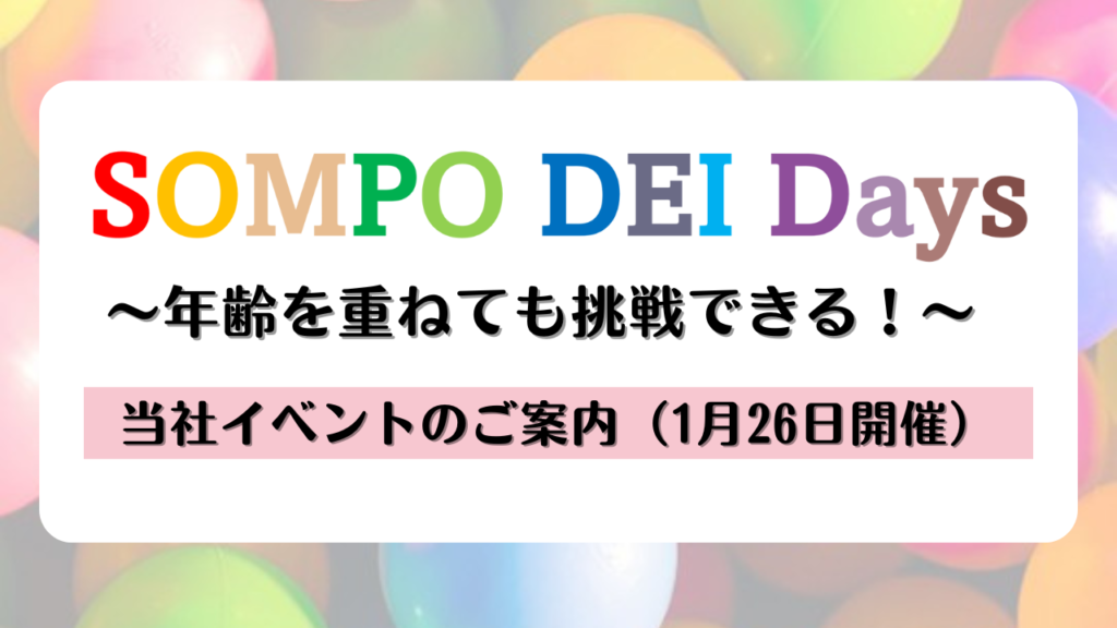多様性 NEW ニュース 2026.01.20 【開催間近!】SOMPO DEI Days ~年齢を重ねても挑戦できる!~当社イベントのご案内(1/26開催) 多様性・公平性・包括性を考えるグループ横断イベント『SOMPO DEI Ⅾays』開催中! SOMPOグループでは、多様な意見や想いを受け止め活・・・ 会社の取り組みつなぐ・つながるDEIシニア多様性SOMPOグループSOMPOケア 10 40 view 1 / 11