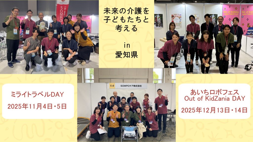 愛知県 NEW イベント 2026.01.23 未来の介護を、子どもたちと考える。~体験型イベント「ミライトラベルDAY」「あいちロボフェス」開催レポート~ 当社では、次世代を担う子どもたちに、介護の仕事の魅力や未来の可能性を伝えるため、地域の教育イベントへ積極的に参加しています。 今回は、2025年・・・ あいちロボフェス愛知県そんぽの家S白鳥南そんぽの家 桜本町ミライトラベルDAY 5 26 view 1 / 11